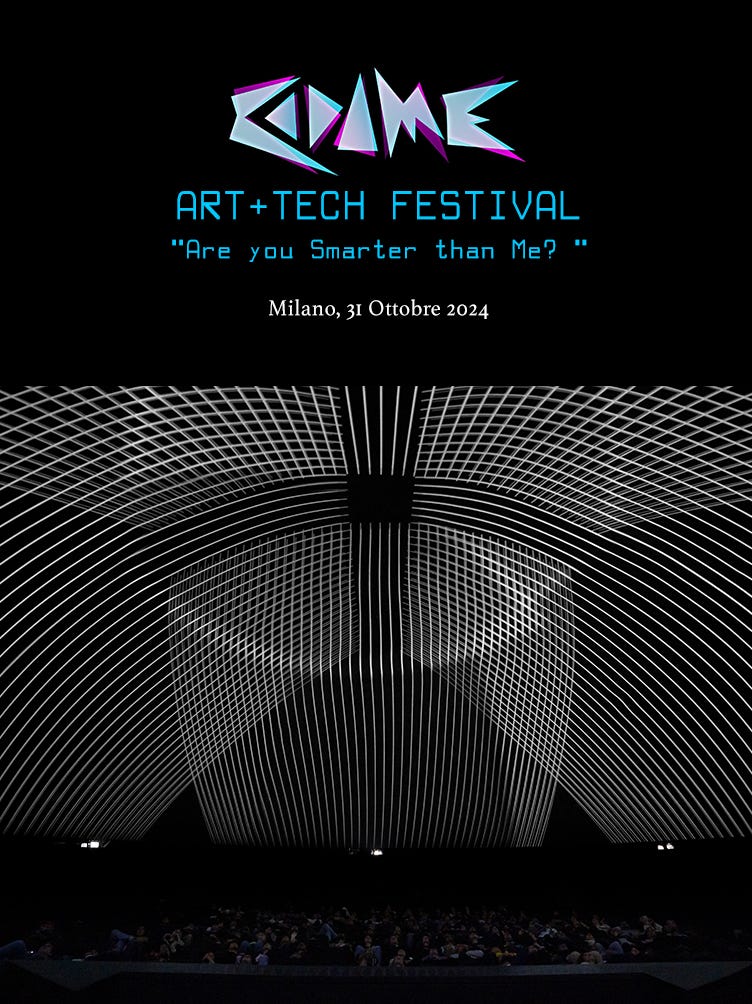 Eccoci alla serata di chiusura del CODAME ART+TECH Festival [2024] #Essence 2024 a Milano! Questa sera celebriamo la creatività attraverso un mix di arte contemporanea e musica elettronica ed esplorando l’intelligenza con "Are You Smarter Than Me?" in costume (se vuoi) in questa serata di Halloween!Che tu sia un artista, un tecnologo o semplicemente curioso del futuro della creatività, questo evento offre una piattaforma per connettersi, collaborare e scoprire. Insieme, ci immergeremo in discussioni stimolanti, creazione artistica collaborativa e presentazioni innovative, per poi colcludere la serata con musica ed esperienze interrattive.18:00-19:00 | Aperitivo