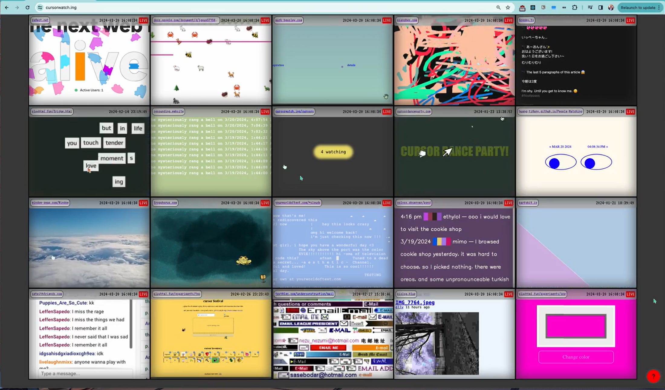 Situating visitors in a position of surveillance, cursor watching reveals itself, upon closer attention, to be a collection of live windows onto corners of the internet.