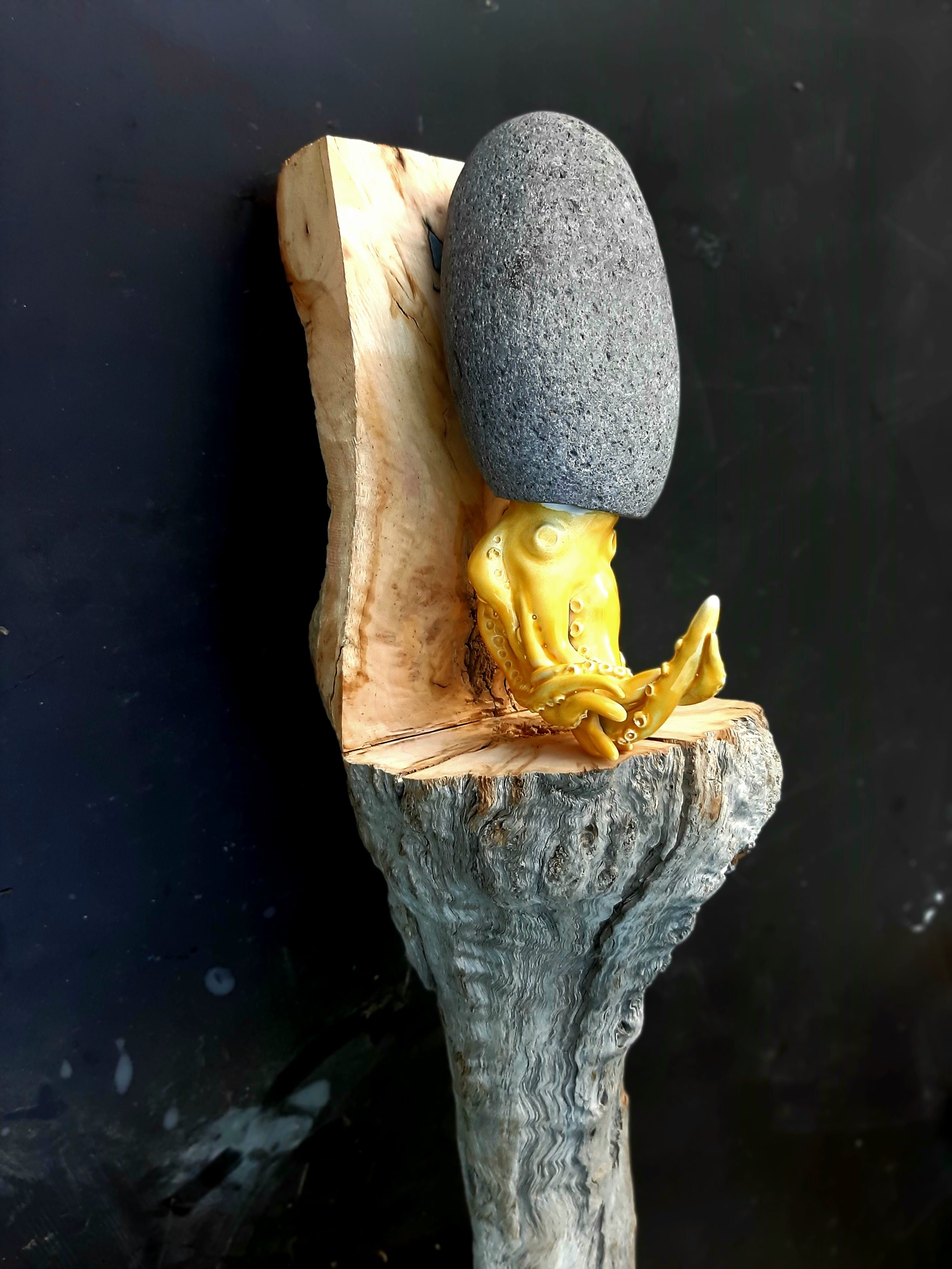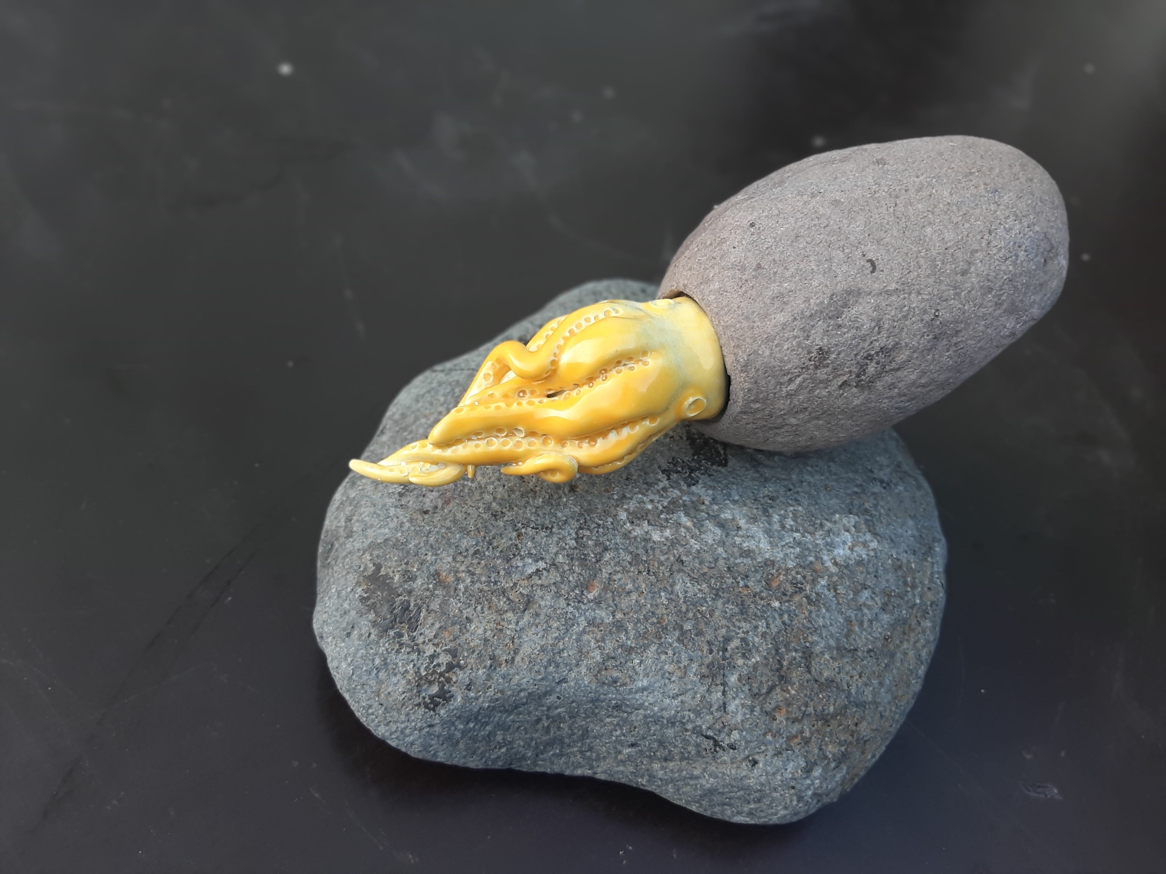 For this project, she created two little sculptures called 'Lula’, named after the submarine. They were made of ceramic, stone, and driftwood. Her squid body and tentacles are yellow, like a submarine with a stone head.