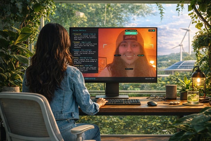 What to look for: Each person in frame gets a persistent Social Battery label (Energized → Engaged → Present → Fading → Needs Space) driven by posture, expression, and movement. The overlay updates continuously and surfaces contextual tips for how to respond to each state.
