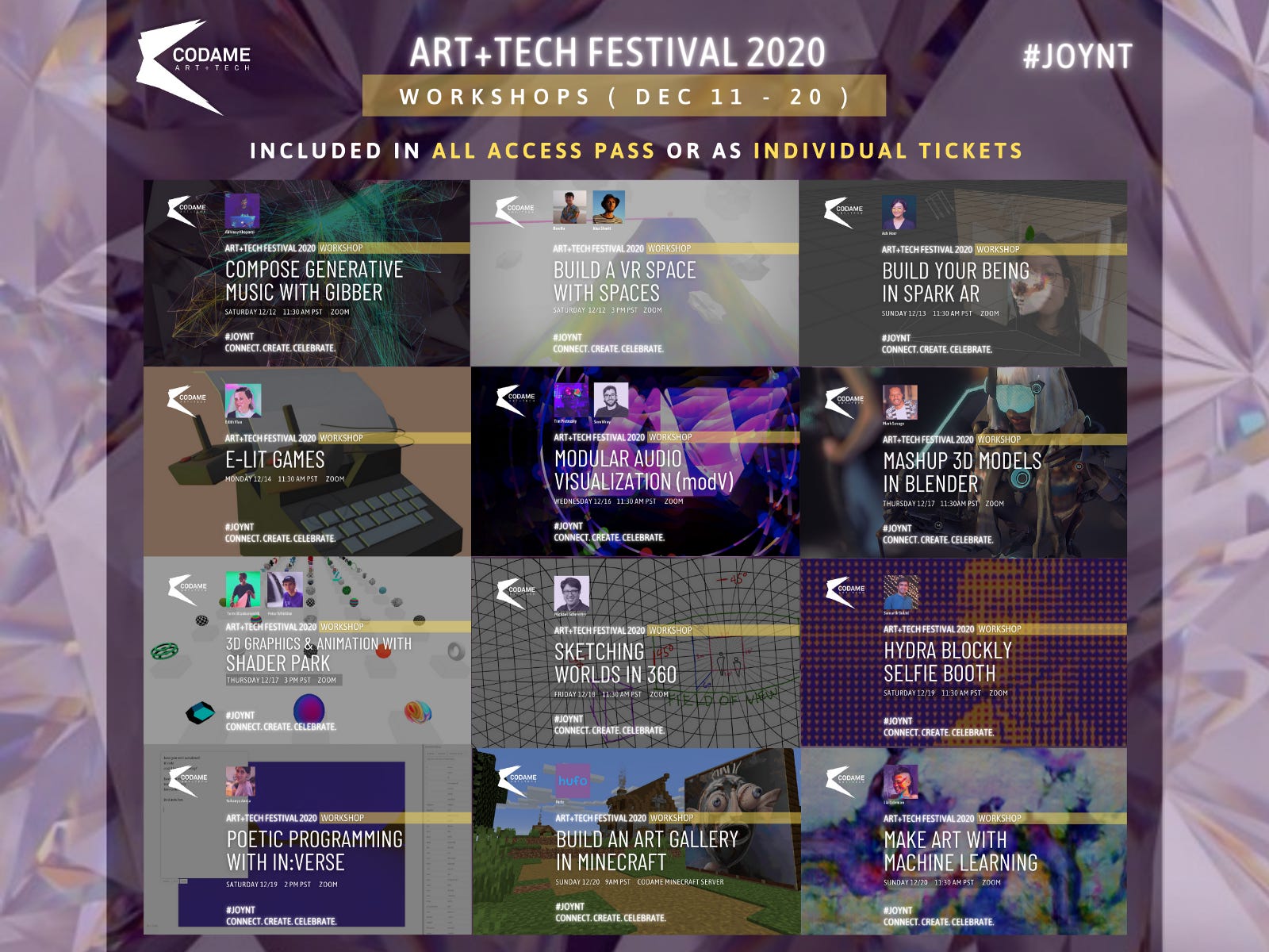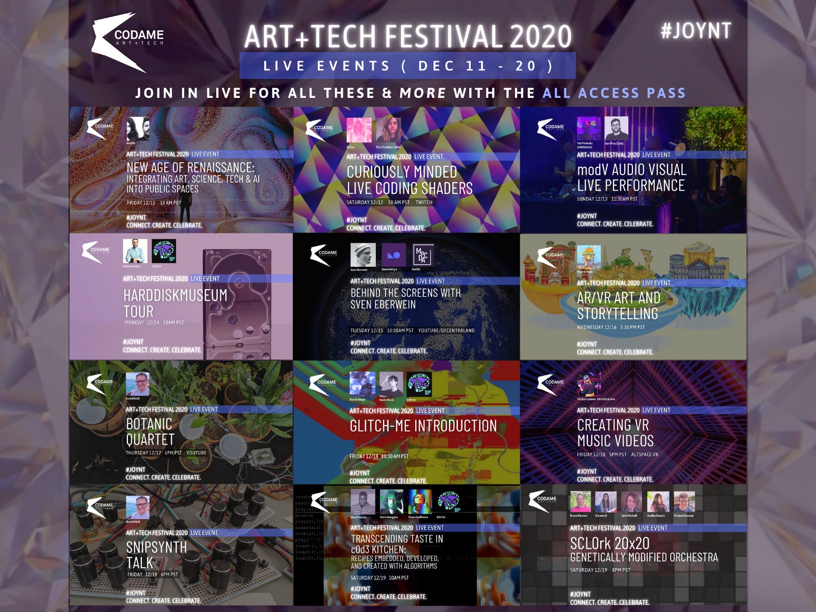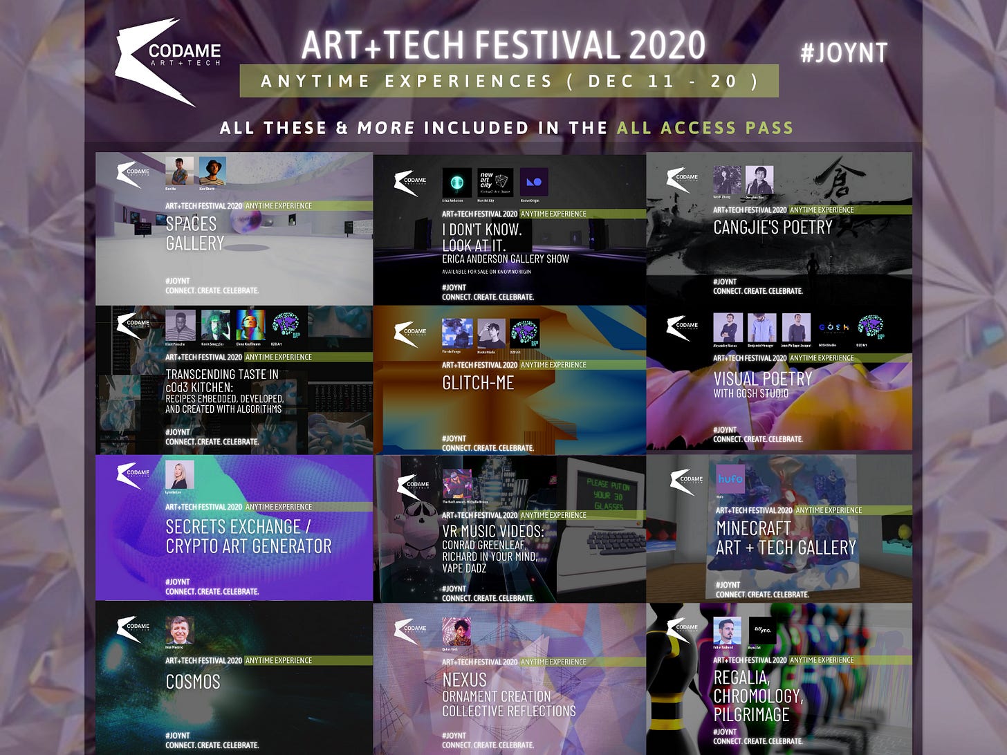 Let’s JOYNT together to spark innovative ideas and extraordinary visions! At the 10th annual ART+TECH Festival you will enjoy around 40+ Live Events, Anytime Experiences, and 16+ Workshops. Created by more than 60+ Artists in collaboration with you!
