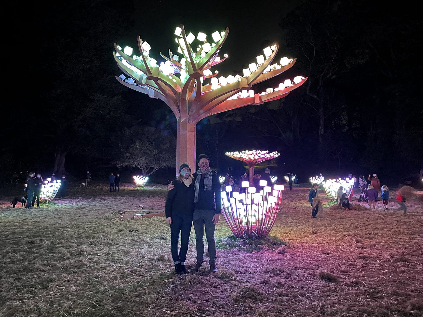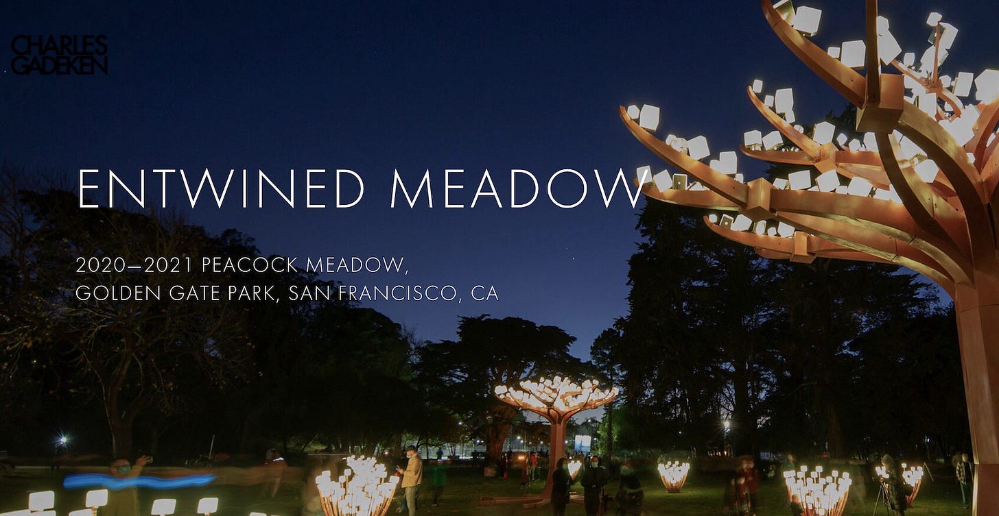 The installation opened on December 10th in Golden Gate Park’s Peacock Meadow near the Conservatory of Flowers. The project is made possible through a partnership between San Francisco’s Recreation and Park Department and the San Francisco Parks Alliance for the Park’s 150th Anniversary finale. Numerous professionals, arts supporters, and volunteers make Gadeken’s large-scale installations possible!